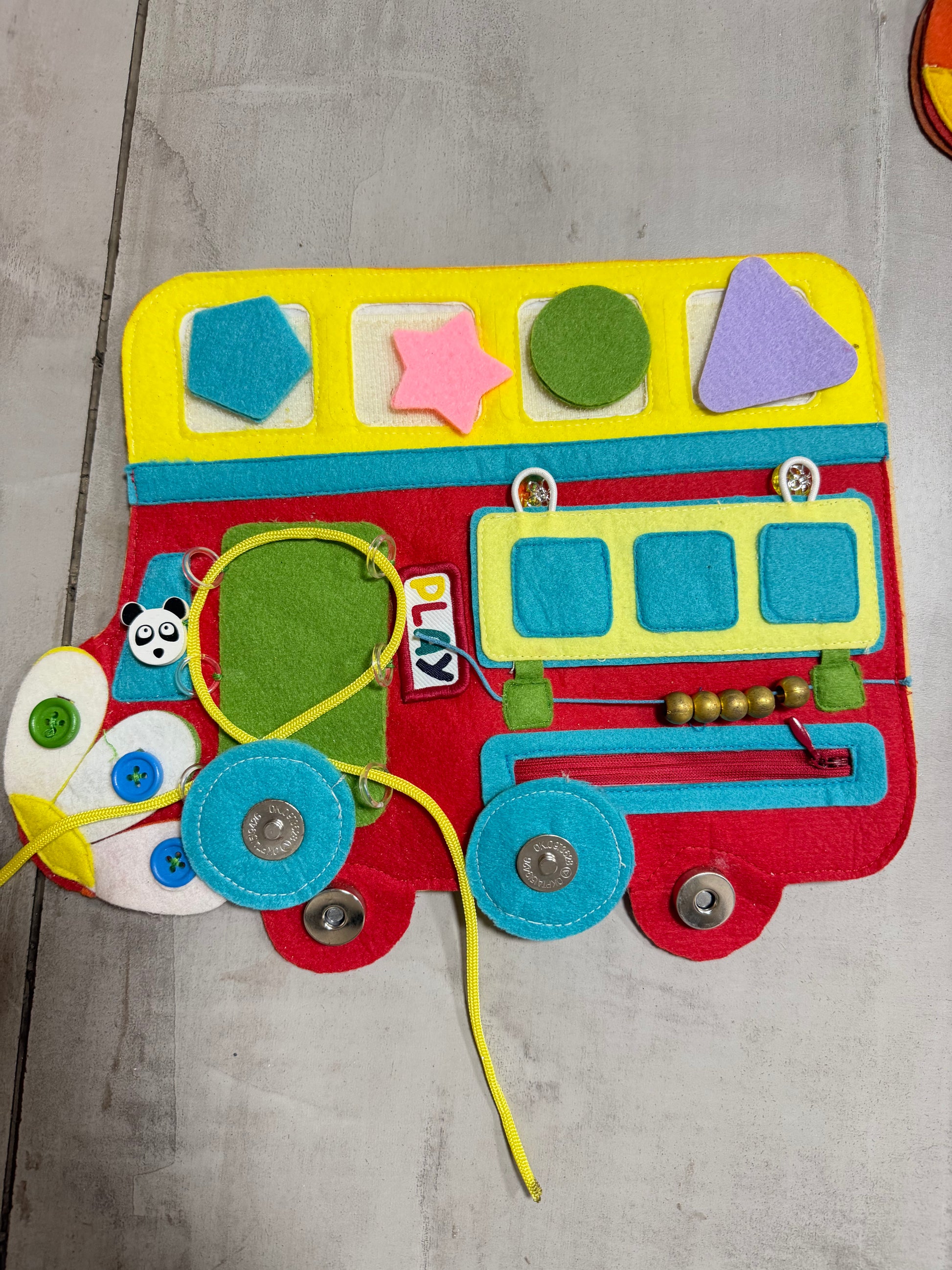 Our Montessori Busy Bus Busy Board is a beautifully handcrafted, sensory-rich learning toy designed to engage toddlers in fine motor play, cognitive development, problem solving, and early life skills—all while having fun!